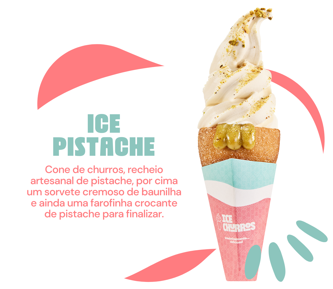 Cone de churros, recheio artesanal de pistache, por cima um sorvete cremoso de baunilha e ainda uma farofinha crocante de pistache para finalizar.