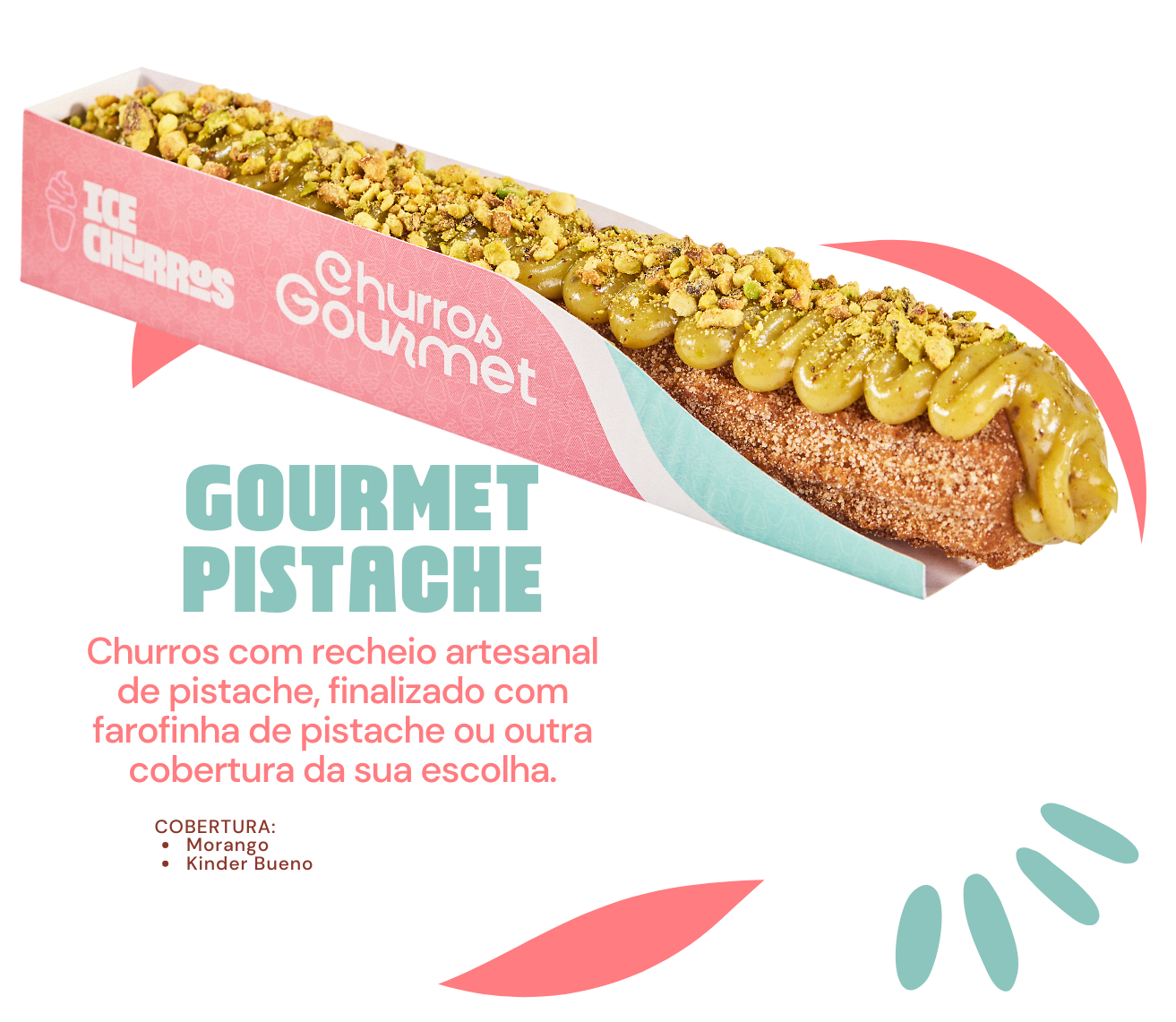 Churros com recheio artesanal de pistache, finalizado com farofinha de pistache ou outra cobertura da sua escolha.